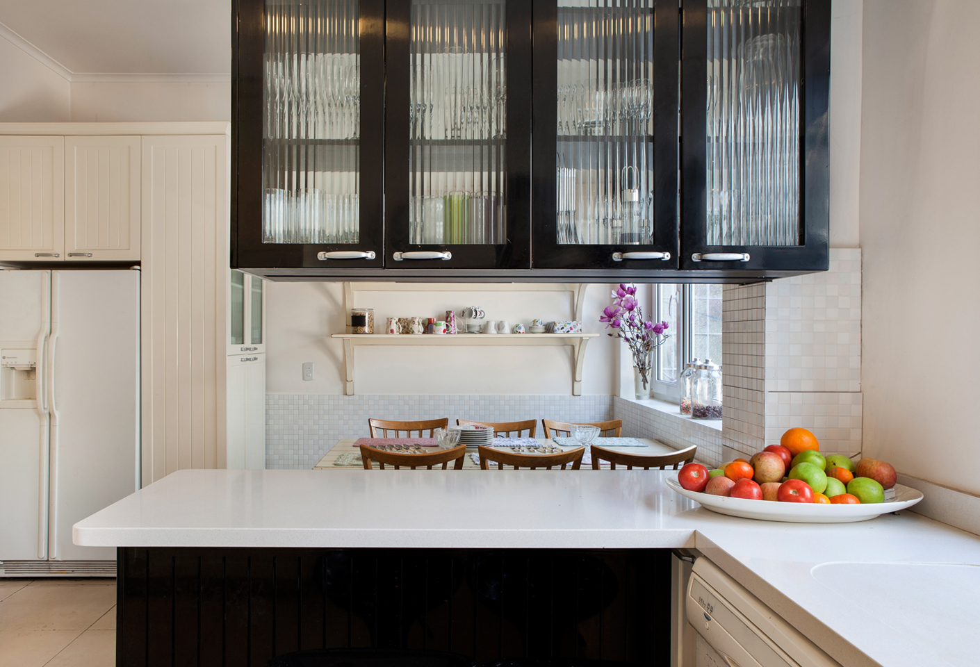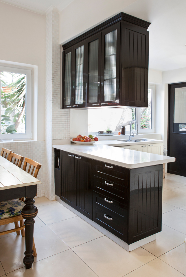 Muebles base en trupán lacado blanco Puertas altas mesón central lacado negro con vidrio en su interior Cubierta silestone blanco norte tirador sobrepuesto