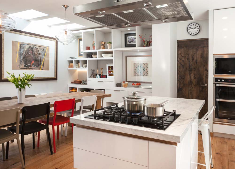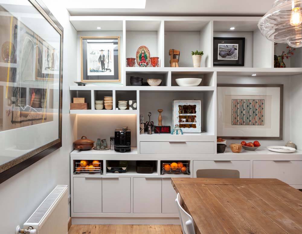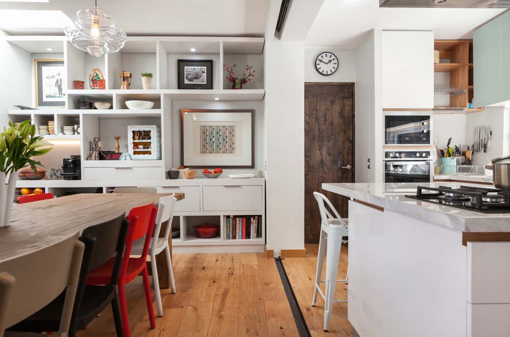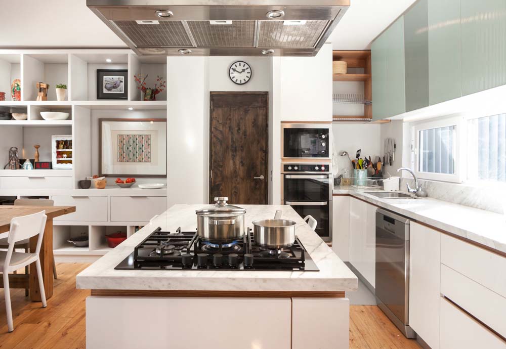 Este proyecto se plantea para una Cocina versátil, distendida donde todos participan en las actividades que se hacen en este espacio living/comedor/cocina/ mueble librero, donde se piensan los nichos según tamaño de cada cuadros y objetos….