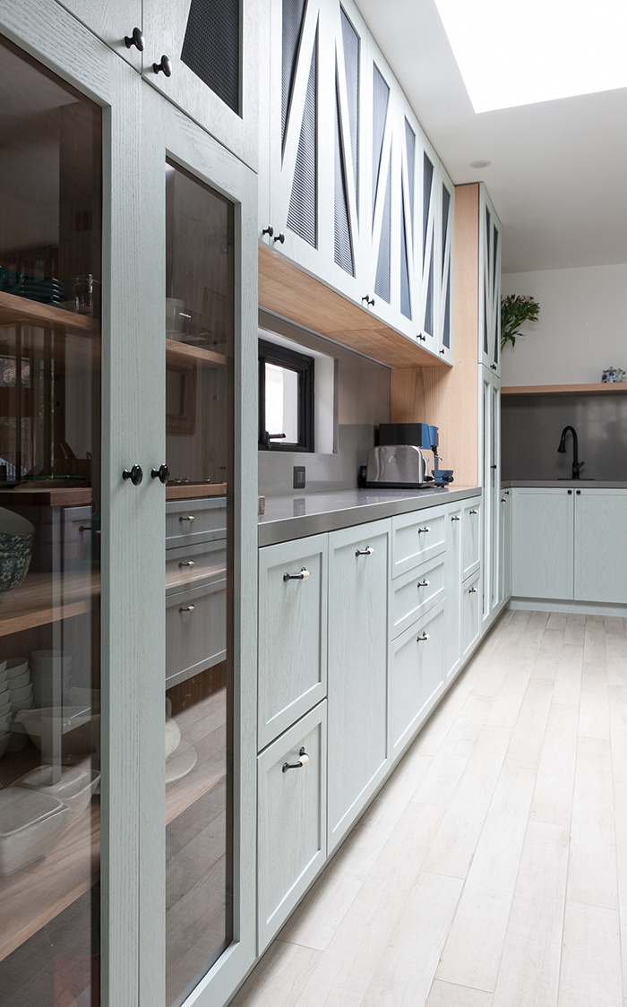 En este proyecto usamos enchape encina con tinte milessi gris/celeste, hicimos las puertas del mueble loza con rejilla para que queden todos los elementos a la vista.